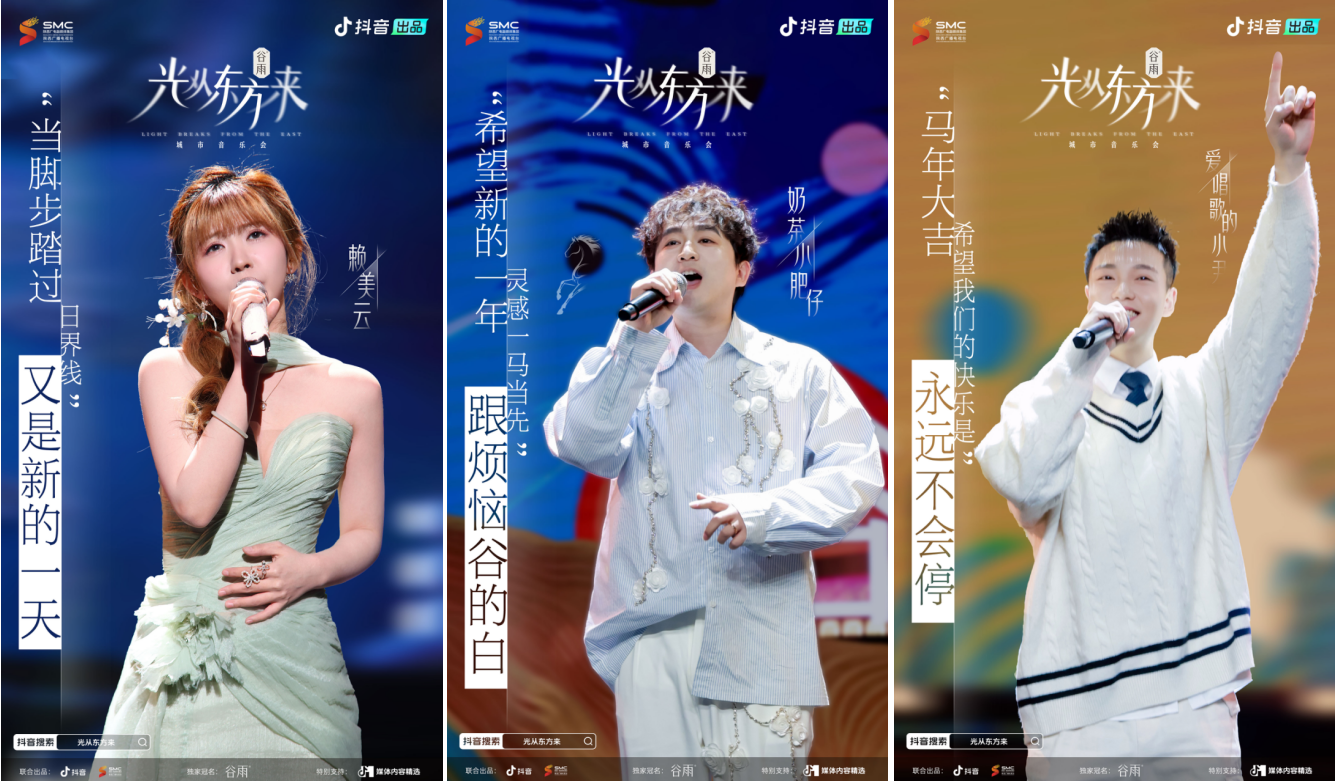 光从东方来所承载的,不仅有非遗美学与舞台能量,还有“生于斯长于斯”的地域文化。直播前期,音乐会抖音官方账号发布了一组西安城市海报,以长安碎片为底,以谐音祝福为文,借西安的民俗与非遗特色向全网提前送上新春祝福。在红火的春节档写下了独属于西安的一笔。